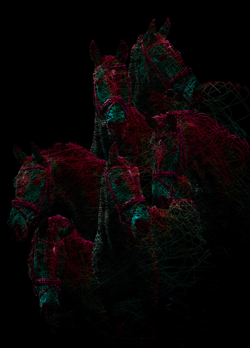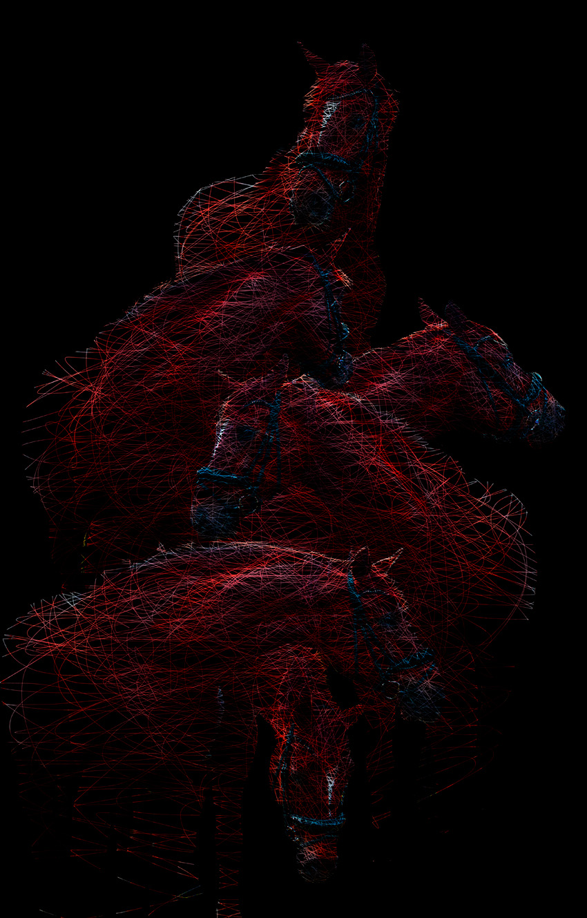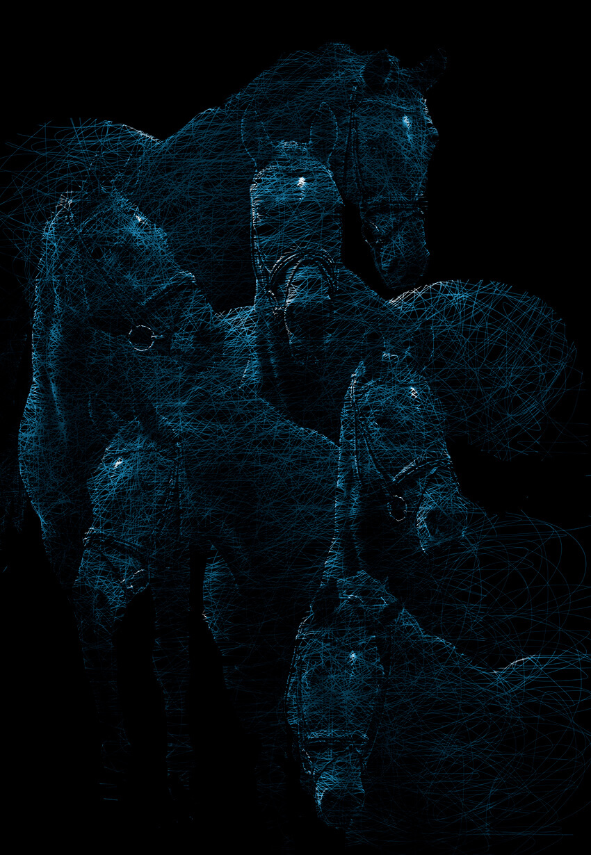 In deze serie ontstaat vorm vanuit het donker. Paarden worden niet direct zichtbaar, maar verschijnen langzaam uit lijnen en contrast. Het werk onderzoekt harmonie en balans welke ontstaan in verbinding van lijnen, als iets dat zich pas toont wanneer je de tijd neemt om echt te kijken. Lijnen kruisen, raken en versterken elkaar, totdat er een vorm ontstaat die zowel krachtig als verstild is.